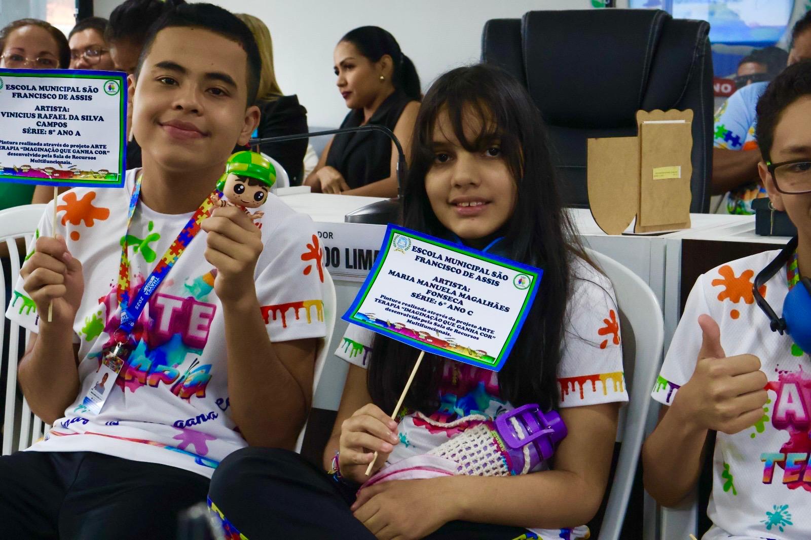 Durante a solenidade, crianças autistas da Escola Municipal São Francisco de Assis apresentaram obras de arte, emocionando e encantando o público. A iniciativa destacou o potencial criativo e a importância da inclusão no ambiente escolar.